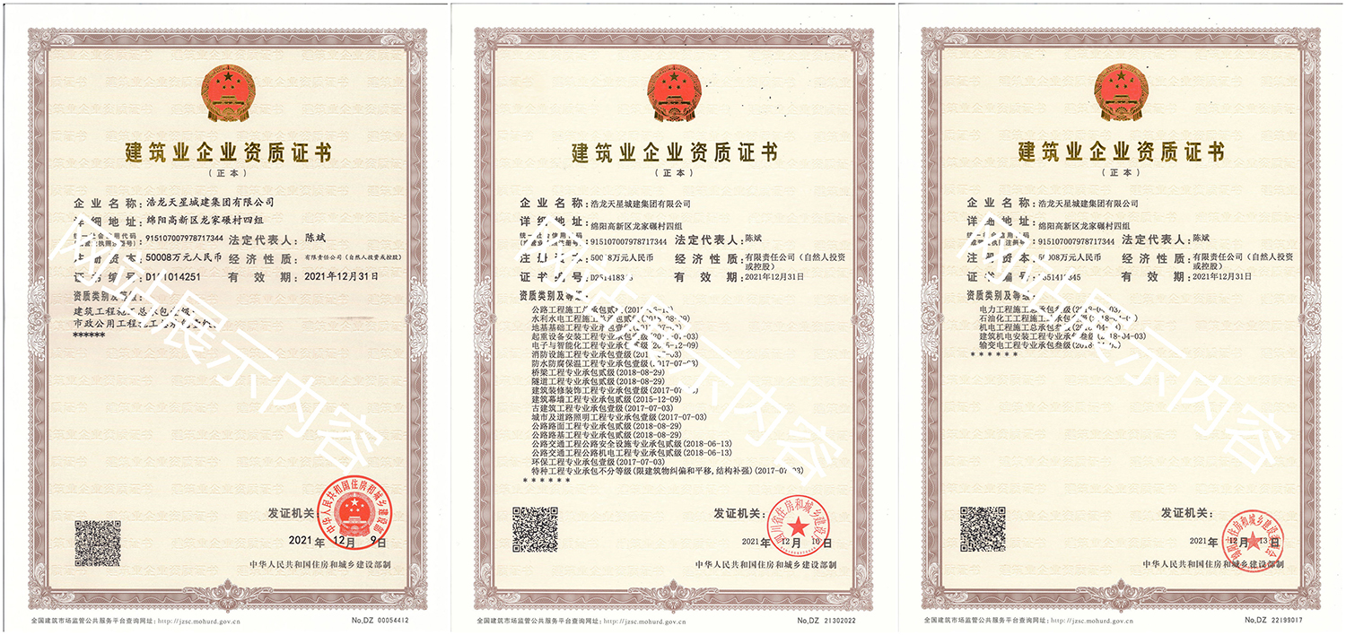 浩龍?zhí)煨浅墙瘓F(tuán)有限公司,2007年成立于“李白故鄉(xiāng)、中國科技城”—四川省綿陽市,企業(yè)注冊資本金5.0008億元。公司共有27項(xiàng)建筑業(yè)企業(yè)資質(zhì),其中國家一級資質(zhì)11項(xiàng),二級資質(zhì)10項(xiàng),三級資質(zhì)5項(xiàng),特種資質(zhì)不分等級1項(xiàng),類別涵蓋建筑、市政、水利、機(jī)電、隧道、起重設(shè)備安裝等基礎(chǔ)及未來發(fā)展重點(diǎn)專業(yè)。公司下設(shè)三個(gè)辦事處,業(yè)務(wù)范圍輻射全國,在建項(xiàng)目三十余個(gè),累計(jì)完成產(chǎn)值超11億元。公司是綿陽市建筑施工企業(yè)協(xié)會(huì)副會(huì)長單位、綿陽遂寧商會(huì)會(huì)長級單位、綿陽首批建筑業(yè)綠卡企業(yè),在綿陽本地企業(yè)中綜合實(shí)力名列前茅。